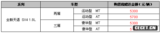從2009年3月10日起,用戶(hù)購買(mǎi)全新天語(yǔ)SX4 1.8L車(chē)型,長(cháng)安鈴木公司在上述指導價(jià)格的基礎上,直接給予用戶(hù)所購車(chē)型應繳納購置稅全額的50%優(yōu)惠。