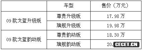 據了解,09款戈藍升級版主要是在原有車(chē)型的基礎上,對配備及價(jià)格進(jìn)行優(yōu)化,并新增韻動(dòng)版車(chē)型。尊貴升級版較原有車(chē)型新增折疊鑰匙和定速巡航等配備,旗艦升級版較原有車(chē)型,取消了方向盤(pán)切換檔功能,增加了折疊鑰匙、定速巡航、副駕座電動(dòng)調節功能、胎壓偵測系統以及采用10輻動(dòng)感鋁圈等配置。韻動(dòng)版則在對應升級版車(chē)型的基礎上,采用了酷炫灰色晶鉆頭燈、亞光水箱護罩、冷峻黑色內裝、運動(dòng)型金屬踏板等式樣,同時(shí)提升了手剎造型及質(zhì)感,并將方向盤(pán)定速巡航控制改成方向盤(pán)切換檔控制。另外,旗艦韻動(dòng)版更將原有8喇叭音響升級為12音路金屬振膜立體聲音響,為用戶(hù)營(yíng)造更豐富的影音體驗。