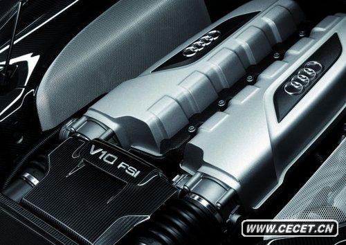 成就這一卓越表現的V型10缸FSI汽油直噴發(fā)動(dòng)機擁有和專(zhuān)業(yè)賽車(chē)一致的高性能特征。其最高轉速可達每分鐘8,700轉,發(fā)動(dòng)機功率和扭矩峰值也分別在8,000轉/分和6,500轉/分的高轉速下出現:最大功率為525馬力(386千瓦),最大扭矩高達530牛·米。