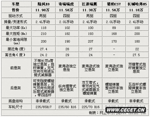 首先,作為一款SUV,人們除了關(guān)注他們的基本信息外,更看重的就是它實(shí)際的通過(guò)性和操控性。通過(guò)上表我們可以看到,除了獵豹CS7,其他4款車(chē)型的離地間隙都處于一個(gè)比較優(yōu)秀的水平上,這為人們日常出行郊游,順利通過(guò)略微惡略的路況提供了保障。另外,值得一提的就是5款SUV的底盤(pán)結構,瑞虎、瑞鷹和CS7三款都采用了中規中矩的承載式設計,而陸風(fēng)X8和哈弗H5則采用了純正的越野車(chē)底盤(pán)設計-非承載式,讓車(chē)輛在越野路況也可以更順暢的通過(guò)。