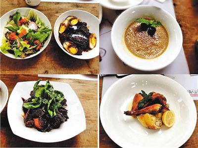從左到右依次為:蔬菜沙拉、鮑魚(yú)紅燒肉、龍井奶凍、忘不了脆皮雞、三杯鵝。新京報記者 武芝 攝