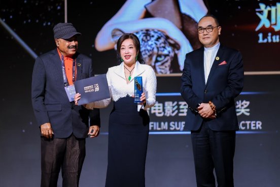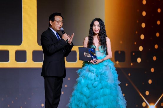 ▲著(zhù)名演員劉曉慶獲頒“華語(yǔ)電影至尊人物獎”