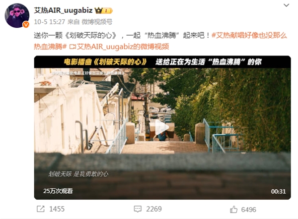 今年9月,艾熱為破億電影《好像也沒(méi)那么熱血沸騰》演唱插曲《劃破天際的心》,表達出的對夢(mèng)想的執著(zhù),對熱愛(ài)的堅定,高度契合電影主題,無(wú)論在任何領(lǐng)域,面對挑戰我們無(wú)所畏懼,披荊斬棘,終將贏(yíng)得內心的勝利。