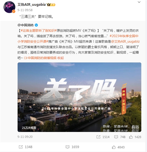 9月,國家消防救援局、教育部聯(lián)合主辦,江蘇省消防救援總隊、江蘇省教育廳承辦,南通市消防救援支隊、南通市教育局協(xié)辦的2023年秋季全國中小學(xué)消防安全公開(kāi)課,由艾熱演唱推廣曲《關(guān)了嗎》。