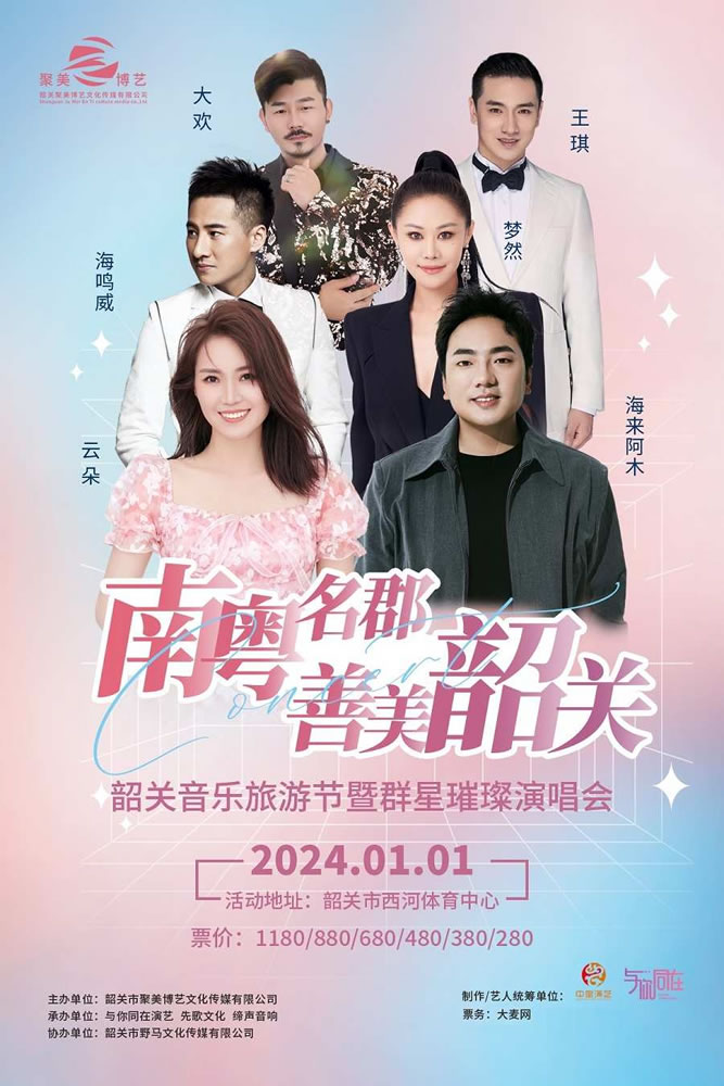 "南粵名郡,善美韶關(guān),2024 年 1 月 1 日,西河體育中心,海來(lái)阿木、云朵、大歡、海鳴威、王琪、夢(mèng)然等明星大咖云集,一場(chǎng)盛大的群星演唱會(huì )即將上演!