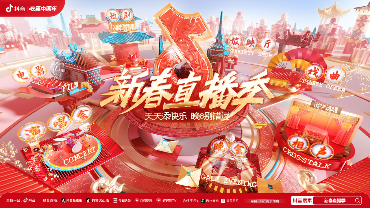 據悉,2024抖音新春直播季聯(lián)動(dòng)了近200位明星藝人、嘉賓大咖及抖音創(chuàng )作者,打造了一場(chǎng)別開(kāi)生面的春節文娛盛宴:新春演唱會(huì )、小年夜晚會(huì )、跨界相聲專(zhuān)場(chǎng)、華彩傳承晚會(huì )、戲曲晚會(huì )、央視春晚及元宵晚會(huì )、地方臺春晚、春節檔電影主創(chuàng )直播、明星創(chuàng )作者系列直播......超百場(chǎng)精彩紛呈的內容輪番上演,形式多樣的福利彩蛋拉滿(mǎn)過(guò)年儀式感,不僅滿(mǎn)足了不同觀(guān)眾的喜好,也讓2024抖音新春直播季成為了今年春節合家歡的重要選擇。