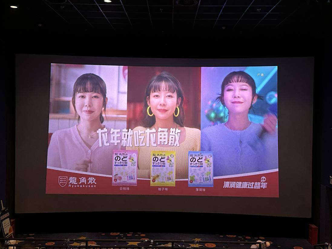 龍角散在今年春節期間,強勢霸屏各大院線(xiàn)賀歲檔黃金展示位——投放全國100+城市的近2000家影院,覆蓋超10000塊大屏幕,在熱門(mén)影片《熱辣滾燙》、《熊出沒(méi)之逆轉時(shí)空》、《第二十條》及《飛馳人生2》中均有映前或貼片廣告露出,再創(chuàng )品牌曝光熱潮。