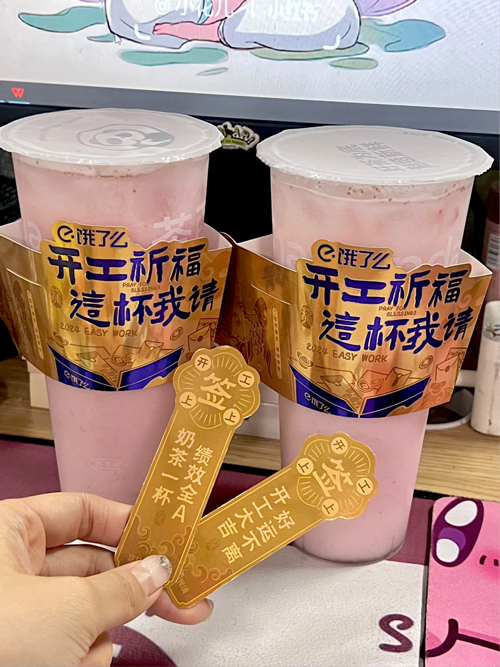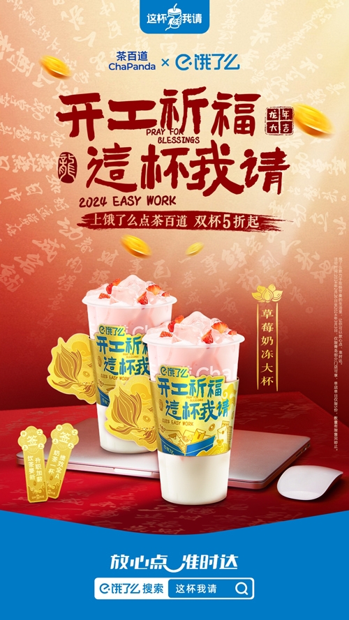 餓了么借助青島文旅背書(shū),聯(lián)合了各大商戶(hù)諸如茶百道、奈雪的茶等,打造了一款獨特的“福簽奶茶”,以金光杯套、好運福簽和開(kāi)工祝詞為特色,將奶茶文化與求簽祈福相結合,實(shí)現了營(yíng)銷(xiāo)閉環(huán)。同時(shí),杯套內還藏有多元款式的福簽,讓消費者在享受美味奶茶的同時(shí),也能感受到祈福的樂(lè )趣。