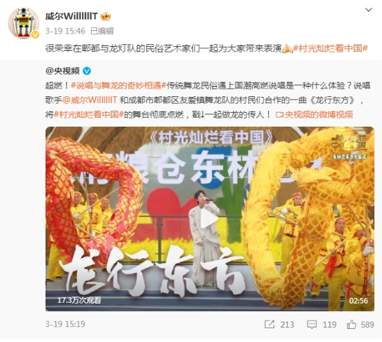 3月16日,由中央廣播電視總臺央視頻推出的大型融媒體節目《村光燦爛看中國》走進(jìn)成都市郫都區東林藝術(shù)村,拉開(kāi)“天府糧倉·東林藝術(shù)季”的大幕,用文化的力量點(diǎn)亮鄉村振興的新篇章。種夢(mèng)音樂(lè )D.M.G藝人威爾Will.T和成都市郫都區友愛(ài)鎮舞龍隊的民俗藝術(shù)家們合作的一曲《龍行東方》,傳統舞龍特色遇上時(shí)下流行的說(shuō)唱音樂(lè ),將舞臺徹底點(diǎn)燃。