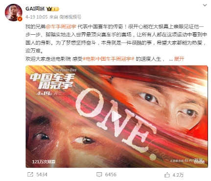4月19日,中國首部華語(yǔ)職業(yè)賽車(chē)手紀實(shí)電影《中國車(chē)手周冠宇》全國上映,由GAI周延演唱的電影主題曲《ONE》MV也于同天上線(xiàn)。GAI周延不僅在微博上表達了對周冠宇的支持“我的兄弟@車(chē)手周冠宇 代表中國賽車(chē)的傳奇!很開(kāi)心能在大銀幕上親眼見(jiàn)證他一步一步、腳踏實(shí)地走入世界最頂尖賽車(chē)手的賽場(chǎng),讓所有人都在這項運動(dòng)中看到中國人的身影。為了夢(mèng)想堅持奮斗,本身就是一件很酷的事,希望大家都能為熱愛(ài),迎萬(wàn)難。歡迎大家走進(jìn)電影院 感受#電影中國車(chē)手周冠宇# 的速度人生,也歡迎大家一起收聽(tīng)《ONE》。”,還去F1中國大獎賽現場(chǎng)為周冠宇比賽加油助威,中國第一RapperGAI周延與中國第一F1車(chē)手周冠宇的夢(mèng)幻聯(lián)動(dòng),也讓粉絲激動(dòng)不已。