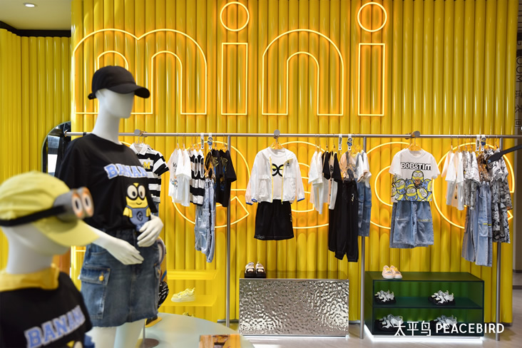 旗艦店正門(mén)入口處,PEACEBIRD聯(lián)動(dòng)法國著(zhù)名潮流藝術(shù)家組合Leo&Steph的全球現象級IP:KID CUP,巨大的IP形象裝置奪人眼球。一樓是品牌旗下多個(gè)產(chǎn)品線(xiàn)的匯聚之地,包括太平鳥(niǎo)男裝(PEACEBIRD MEN)、太平鳥(niǎo)女裝(PEACEBIRD WOMEN)以及少女裝樂(lè )町(LEDiN),男女裝區域采用了肌理墻面設計,大面積留白,其簡(jiǎn)約大氣的高級感,與陳列產(chǎn)品交相呼應,相得益彰;而樂(lè )町(LEDiN)空間則以極具代表性的高級粉作為裝飾,增添了一抹柔和的色彩。旗艦店二樓,明亮黃的童裝mini peace區域,色彩繽紛,充滿(mǎn)趣味的兒童游玩裝置,吸引孩子們盡情玩耍,大人們則可在此輕松選購,享受親子購物的溫馨時(shí)光。