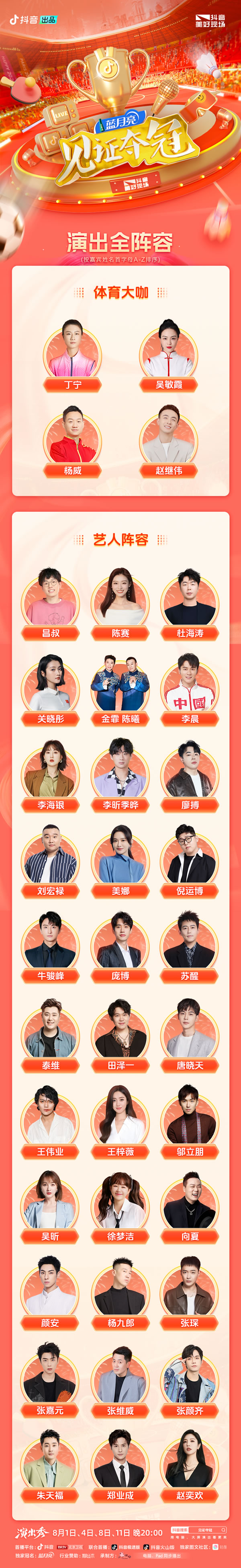現在上抖音搜索【見(jiàn)證奪冠】進(jìn)行預約,8月1日、4日、8日、11日每天20:00按時(shí)與你會(huì )面,用全新陣容、全新設定、全新節目,見(jiàn)證全新精彩!全民奧運,火熱一夏!