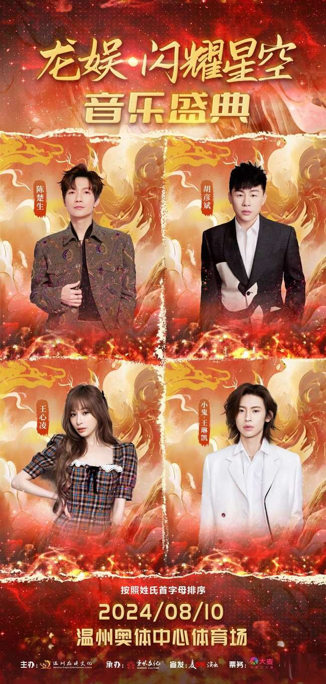 龍娛☆閃耀星空音樂(lè )盛典,帶上你的crush,和 王心凌、陳楚生、胡彥斌、小鬼-王琳凱 共度七夕之夜,愛(ài)自己是終身浪漫的開(kāi)始,音樂(lè )是最浪漫的一種,振奮你的熱情,暫停你的疲倦,治愈你的生活,8月10日,千年商港 幸福溫州,來(lái)溫州市奧體中心主體育場(chǎng)邂逅你的專(zhuān)屬浪漫吧!