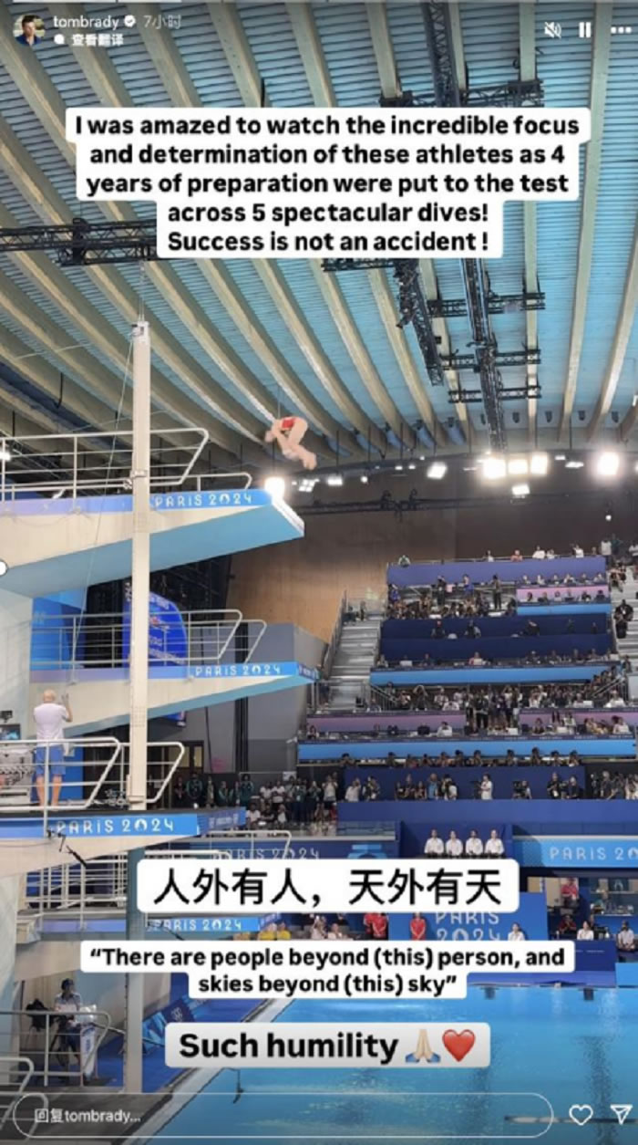 湯姆·布雷迪在個(gè)人社交媒體為中國跳水運動(dòng)員喝彩