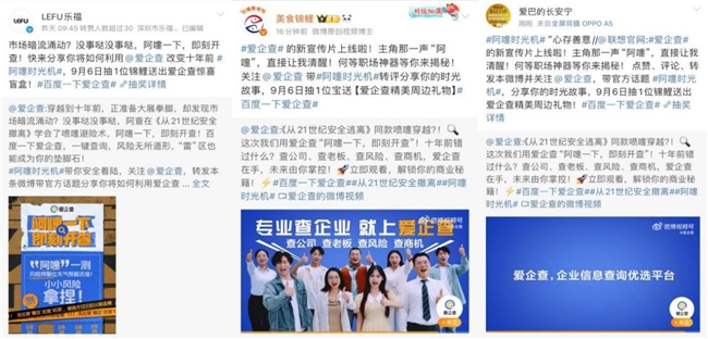 宣傳片上線(xiàn)后,為了進(jìn)一步擴大“阿嚏時(shí)光機”的傳播效果,愛(ài)企查還充分利用了微博、小紅書(shū)、視頻號等多個(gè)媒體平臺,通過(guò)多樣化的內容形式和傳播策略,更廣泛觸達受眾群體。