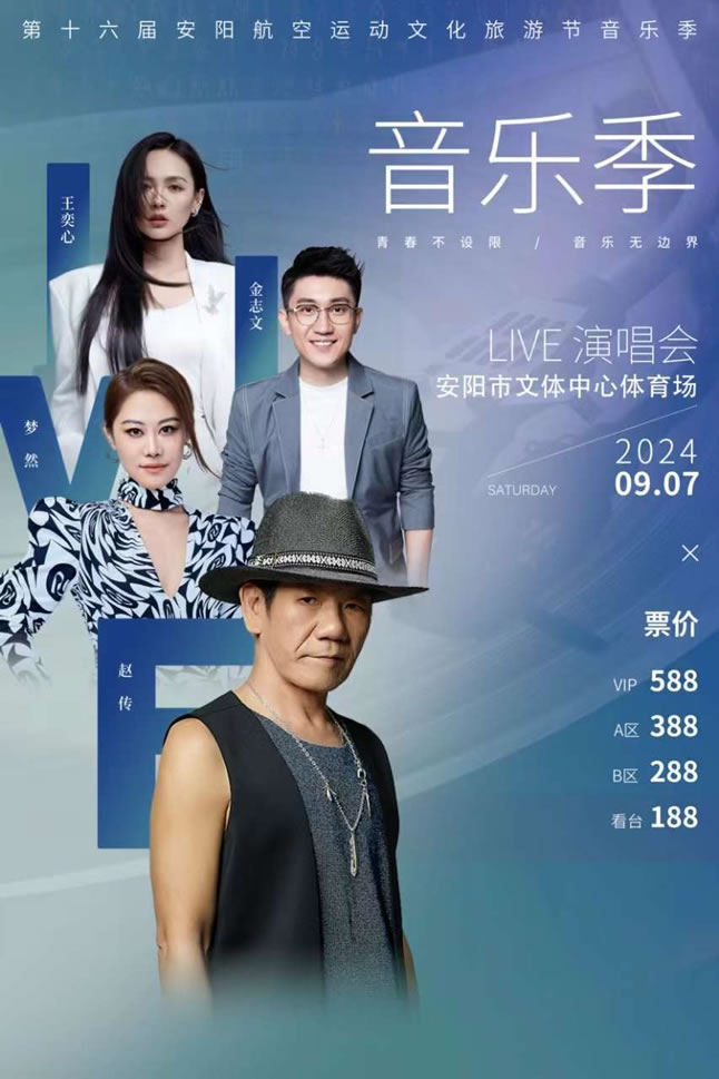 搖滾與深情的碰撞,趙傳、金志文、夢(mèng)然、王奕心邀您共賞經(jīng)典與現代的交響樂(lè )章。他們將用歌聲點(diǎn)燃現場(chǎng),帶你穿越歲月的長(cháng)河,感受音樂(lè )的無(wú)限魅力。藍天為幕,音樂(lè )為橋,航空音樂(lè )季帶你穿越云端,觸碰夢(mèng)想的旋律!這不僅是一場(chǎng)音樂(lè )的盛宴,更是一次航空與藝術(shù)的完美交融。9月7日,安陽(yáng)市文體中心體育場(chǎng),讓我們在音樂(lè )中相遇,共同創(chuàng )造難忘的回憶!