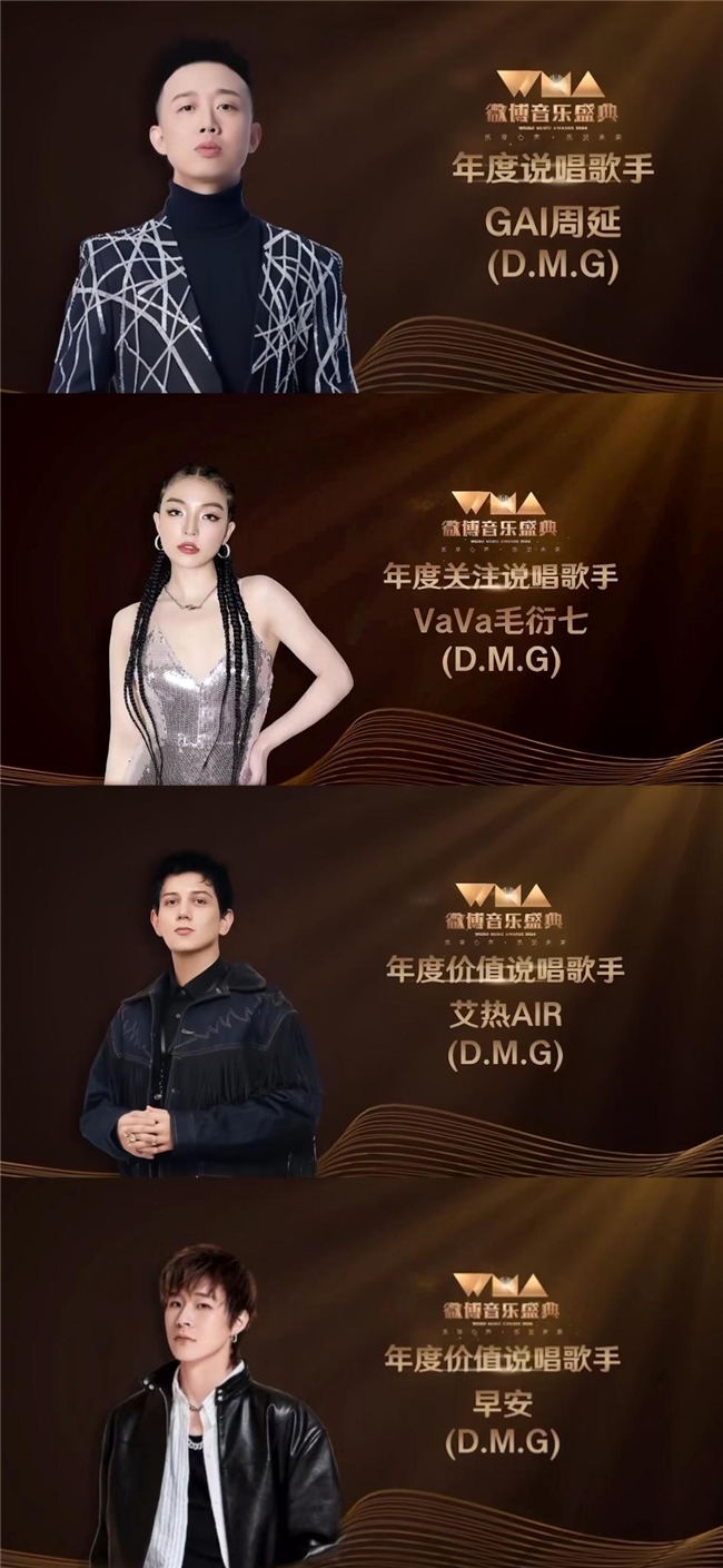 9月25日,微博音樂(lè )盛典在北京舉辦,眾星璀璨,陣容強大,實(shí)力派歌手與新生代偶像齊聚,種夢(mèng)音樂(lè )D.M.G創(chuàng )始人韓嘯攜藝人GAI周延、VaVa毛衍七、艾熱AIR、早安、史宗倫Xyber、Swang多雷、KiWhale沈川綺出席活動(dòng)現場(chǎng),盛裝亮相紅毯并在頒獎典禮斬獲四項榮譽(yù)大獎。