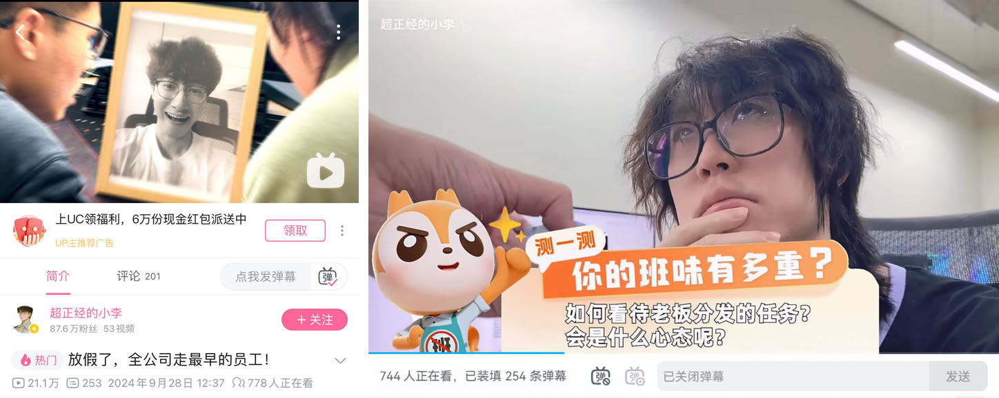 與此同時(shí),B站知名UP主超正經(jīng)的小李的公司遭受“班味”襲擊!面對老板給員工增壓、惡意增加“班味”,小李如何用UC創(chuàng )造一個(gè)沒(méi)有“班味”的世界。