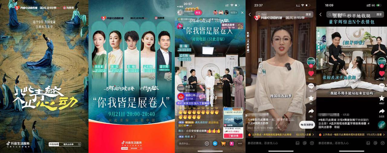 心中若能容丘壑,下筆方能匯山河!竾L(fēng)古韻季」還聯(lián)動(dòng)了“只此青綠”這一熱門(mén)影視iP,攜手打造了一場(chǎng)“你我皆是展卷人”主題直播,在“與輝同行”直播間內,不僅深情對談了影片導演、主演等主創(chuàng )人員,還為大家上線(xiàn)了電影代金券,一經(jīng)上線(xiàn)五萬(wàn)張代金券一搶而空。此外,《只此青綠》的導演周莉亞、韓真,主演張瀚、孟慶旸也親自為心動(dòng)目的地江西站打call,誠邀大家一同探尋《千里江山圖》與江西山水的神秘淵源,為活動(dòng)增添了豐富的文化內涵和吸引力。