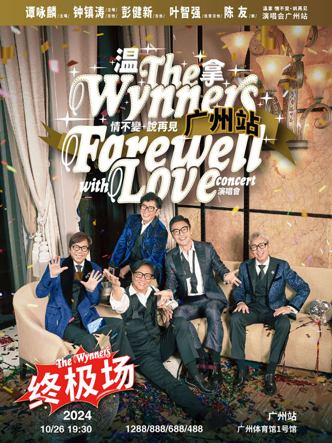 [溫拿The Wynners Farewell with LOVE]首站香港在2023年8月舉行,9月舉行澳門(mén)站,11月馬來(lái)西亞站,12月新加坡站,2024年1月,舉行告別巡演內地首場(chǎng)上海站,活力充沛的溫拿五虎趁著(zhù)仍然好的狀態(tài)下給大家留下美好50年的珍貴回憶,與全球歌迷一一說(shuō)再見(jiàn),溫拿承諾大家,雖說(shuō)再見(jiàn),但情不變。