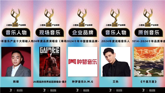 在剛剛過(guò)去的2024音樂(lè )財經(jīng)十周年博覽會(huì )上,種夢(mèng)音樂(lè )D.M.G及旗下藝人也獲評五項大獎。種夢(mèng)音樂(lè )D.M.G榮獲“2014-2024十年音娛品牌”,韓嘯獲評“十年音樂(lè )產(chǎn)業(yè)領(lǐng)袖人物”,《GAI進(jìn)化論》2024演唱會(huì )-重慶站獲評“2024年度十大品質(zhì)演唱會(huì )單場(chǎng)”,艾熱AIR榮獲“2024年度說(shuō)唱音樂(lè )人”,歌曲《千里萬(wàn)里》榮獲“十年品質(zhì)單曲”獎。