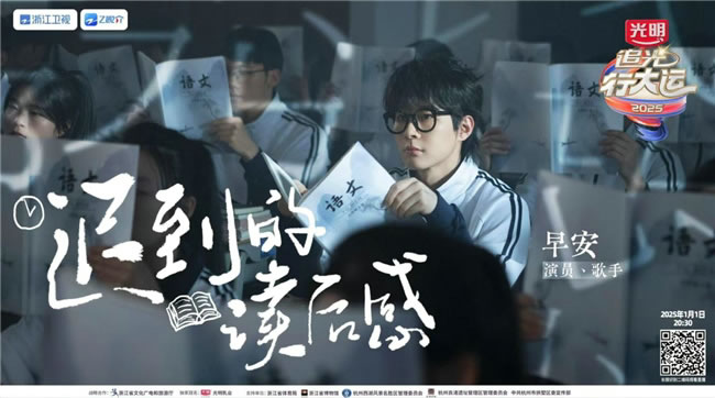 2025年元旦,由浙江衛視推出的文化開(kāi)年特別節目《2025追光行大運》播出,節目打造沉浸式的城市派對和泛文化潮流現場(chǎng),用十支超級視頻組成十大“好運錦囊”,為觀(guān)眾送上新年第一份好運Buff。其中,早安創(chuàng )作演唱的歌曲《遲到的讀后感》,跨越時(shí)空維度,重返校園時(shí)光,追憶課堂上的那些事兒,用富有文化底蘊且妙趣橫生的歌詞,在新年之際帶領(lǐng)大家領(lǐng)略青春美好,用不一樣的視角洞察人生智慧。