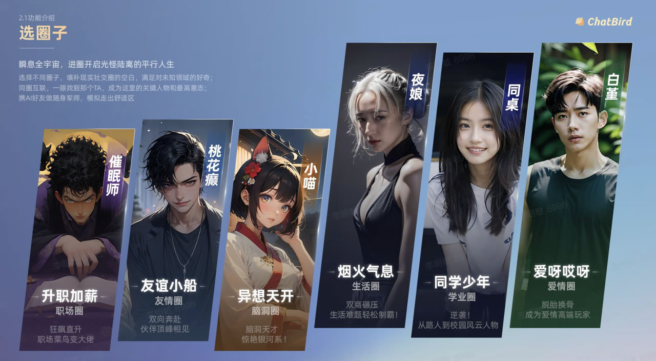 值得一提的是,ChatBird內目前構建了6個(gè)不同類(lèi)型的圈子,擁有著(zhù)形形色色的虛擬角色,隨著(zhù)ChatBird的不斷更新,相信它將在情感陪伴之余,為更多群體、場(chǎng)景帶來(lái)幫助。