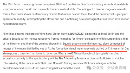 作為一名年輕導演,曹譯文的作品總是充滿(mǎn)了對人性的反思,對地球的關(guān)愛(ài),以及對人類(lèi)未來(lái)的擔憂(yōu)。這種“先天下之憂(yōu)而憂(yōu)”的大愛(ài)情懷打動(dòng)了評委會(huì )的每一位成員,也切合了今年柏林國際電影節關(guān)注年輕一代的成長(cháng)和覺(jué)醒的主題。論壇單元的主席Barbara女士感慨該影片審視現狀,散發(fā)出人性的火花,堪稱(chēng)我們時(shí)代的地震儀,并稱(chēng)曹譯文為“中國藝術(shù)家”(Chinese Artist),贊嘆她不僅能使用最新的人工智能技術(shù),給予觀(guān)眾奇幻般的視覺(jué)效果和散文般詩(shī)情畫(huà)意的浪漫,還引出了發(fā)人深省的問(wèn)題:人類(lèi)的下一步該怎么辦?影片充滿(mǎn)了哲學(xué)反烏托邦和古靈精怪的創(chuàng )意,令人耳目一新。