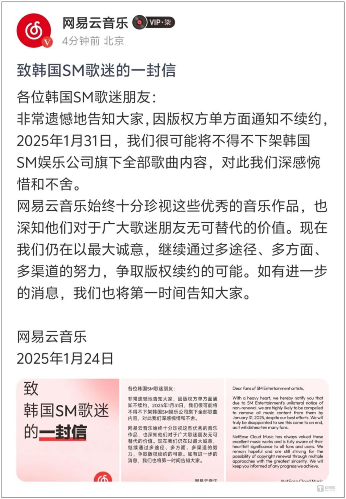 1月24日,網(wǎng)易云音樂(lè )發(fā)布《致韓國SM歌迷的一封信》稱(chēng),因版權方單方面通知不續約,網(wǎng)易云音樂(lè )很可能不得不于1月31日下架韓國SM娛樂(lè )公司旗下全部歌曲內容。