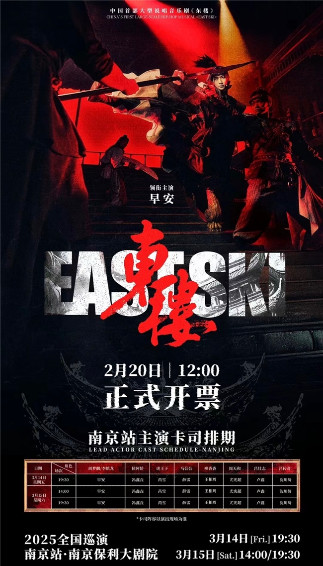 2月20日,由種夢(mèng)音樂(lè )D.M.G出品,早安領(lǐng)銜主演的中國首部大型說(shuō)唱音樂(lè )劇《東樓》2025全國巡演首站南京站正式開(kāi)票。演出將于3月14日-15日在南京保利大劇院連演兩天,北京、上海、成都三站隨后也將陸續開(kāi)票。選擇家鄉南京拉開(kāi)2025開(kāi)年序幕,早安回到夢(mèng)想的起點(diǎn),致敬家鄉,致敬舞臺,也希望將圓夢(mèng)的幸福與《東樓》的精神力量分享給所有觀(guān)眾。通過(guò)這部氣勢恢宏的武俠史詩(shī)巨制,與大家一起感受東方美學(xué)的磅礴大氣,和現代說(shuō)唱的熱血快意。