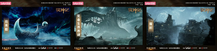 除了在文化傳承方面的貢獻,《牧神記》在畫(huà)面呈現方面也用心良苦。幕后采訪(fǎng)中,制作團隊嘗試在不背離原著(zhù)小說(shuō)的基礎上,有思考的將現實(shí)民俗文化和傳統東方元素與原有設定融合。如為殘老村的高手完善 “風(fēng)華絕代” 的造型,以此凸顯肉體破損精神飛升的人設對比;吸收借鑒穢跡金剛經(jīng)、燕樂(lè )半字譜、小篆及其他楔形文字的風(fēng)格,對《牧神記》神魔等字體思路進(jìn)行差異包裝;而作為《牧神記》初篇的起點(diǎn)、主角團們生活的 “殘老村” 也充分借鑒了新石器晚期的良渚文化,茅草與石土的質(zhì)樸和詭譎奇異的大墟形成對照,最終不以風(fēng)格化為目的的《牧神記》終于以其獨有的“暗黑國風(fēng)”和細致入微的刻畫(huà)在品類(lèi)繁多的3D國產(chǎn)動(dòng)畫(huà)賽道以真“黑”馬的身份脫穎而出。