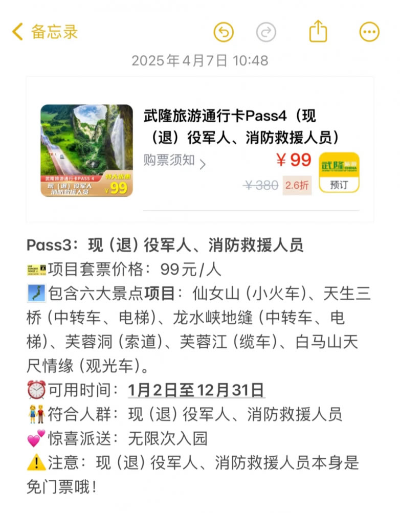 山東籍游客、人民教師、人民警察、醫護人員、現(退)軍人、消防人員注意啦!武隆為你們準備了專(zhuān)屬套票。山東籍游客僅需99.9元,就能暢玩仙女山、天生三橋等六大景區;教師、警察、醫護人員,花199元就能拿下包含門(mén)票、中轉車(chē)、索道等在內的超值套票;現(退)役軍人與消防救援人員,99元即可享受項目套票,在免門(mén)票基礎上暢玩無(wú)憂(yōu) 。這是武隆對你們的敬意與感謝。