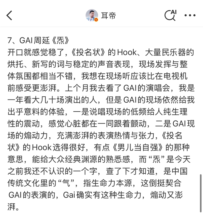 在《歌手2025》的舞臺,GAI攜歌曲《炁》一登場(chǎng)便氣場(chǎng)全開(kāi),演唱全程游刃有余,舞臺感染力爆棚。微博話(huà)題#最穩的竟然是GAI#引發(fā)廣泛關(guān)注與熱烈討論,觀(guān)眾紛紛贊嘆“GAI的現場(chǎng)實(shí)力,穩得不像話(huà),開(kāi)口便被折服。”“前有米奇·蓋頓的情感轟炸,后有格瑞絲·金斯勒的聲壓強襲,GAI卻筑起了中式說(shuō)唱的結界。”“在直播無(wú)修音的殘酷賽制下,GAI竟成了全場(chǎng)最穩的定海神針”。知名樂(lè )評人耳帝稱(chēng)贊GAI的舞臺《炁》“開(kāi)口就感覺(jué)穩了,《投名狀》的Hook、大量民樂(lè )器的烘托、新寫(xiě)的詞與穩定的聲音表現,現場(chǎng)發(fā)揮與整體氛圍都相當不錯,我想在現場(chǎng)聽(tīng)應該比在電視機前感受更澎湃。”