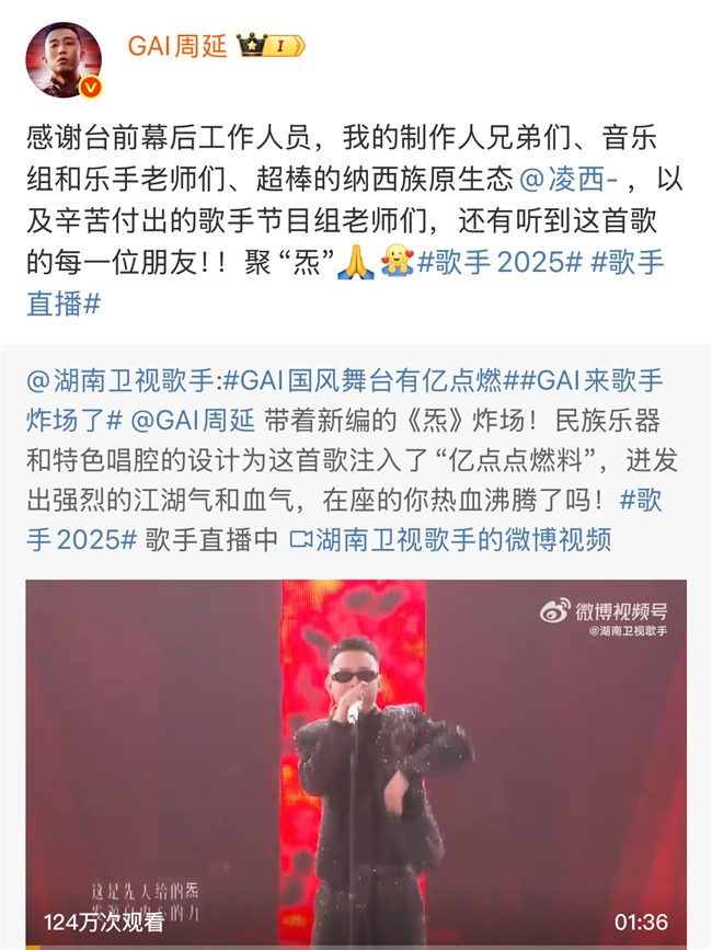 5月16日,湖南衛視《歌手2025》開(kāi)播,集結華語(yǔ)樂(lè )壇中流砥柱、國際音樂(lè )巨匠與新生代先鋒力量,構建一場(chǎng)跨越時(shí)空與文化的音樂(lè )對話(huà)。作為首發(fā)陣容之一的新華流說(shuō)唱領(lǐng)軍人物GAI周延宣布加盟節目,即刻引發(fā)樂(lè )迷的無(wú)限驚喜與期待,他的首場(chǎng)競演舞臺《炁》也不負眾望,穩定發(fā)揮高燃出圈,演唱時(shí)段全國衛視收視率排名TOP1,節目收視率峰值TOP1,以超高熱度霸榜微博、抖音、快手、B站、小紅書(shū)等平臺,官宣至首播日共計斬獲全網(wǎng)熱搜170+個(gè),舞臺全網(wǎng)播放量達3700w+,相關(guān)話(huà)題閱讀量破1億。網(wǎng)友熱評“全場(chǎng)最佳,游刃有余!”“最穩的居然是GAI,說(shuō)唱俠客實(shí)力征服全場(chǎng)”“激情澎湃,大氣磅礴”“蘇黎世歌劇院聽(tīng)了一天歌劇比不過(guò)GAI哥這一嗓子讓我感到震撼”“因為我們都有民族認同感”……