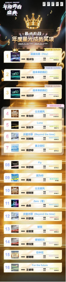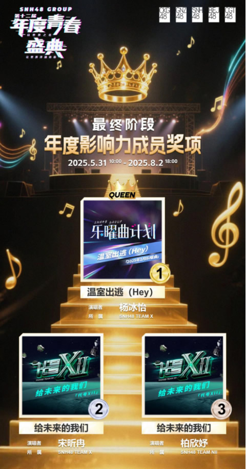 SNH48 GROUP專(zhuān)屬互動(dòng)APP“口袋48”以及海外“MEET48”YOUTUBE官方帳號、SNH48 GROUP 北美區Tiktok官方賬號對盛典頒獎禮進(jìn)行了全程直播。在堅持“以作品為核心,以藝能實(shí)力為考量”的指導下,本屆年度青春盛典歷經(jīng)兩個(gè)月的評審期,誕生了新一批優(yōu)質(zhì)作品。最終,SNH48楊冰怡的作品《溫室出逃(hey)》獲得年度影響力成員金獎及年度巔峰人氣QUEEN榮譽(yù),這也是她首次收獲該項榮譽(yù)。而SNH48宋昕冉的作品《給未來(lái)的我們》、SNH48柏欣妤的作品《給未來(lái)的我們》分獲年度影響力成員銀獎和銅獎,由GNZ48朱怡欣、GNZ48張瓊予、SNH48劉增艷、SNH48蔣舒婷演繹的作品《公主披風(fēng)》《Luna》《步履不停(Beyond the time)》《夏之回憶》分獲年度杰出成員獎項。