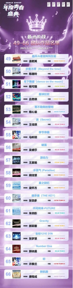 同樣令人欣喜的是,CGT48 TEAM CII的張羽多和許雅蘭也憑借出色的作品入圍“49-66奔跑組”梯隊,展現了CGT48的不凡力量。從0到1,從新生到綻放,CGT48正以驚人的速度成長(cháng)。這支年輕的隊伍用實(shí)力證明:只要心懷熱愛(ài)、永不言棄,夢(mèng)想的種子終會(huì )開(kāi)花結果。她們的成長(cháng)軌跡正激勵著(zhù)更多懷揣偶像夢(mèng)想的女孩勇敢追夢(mèng)。就像TEAM CII《未命名新途》公演那樣,每個(gè)成員都在書(shū)寫(xiě)屬于自己的故事,在TEAM GII《自定義軌跡》的旋律中,每位少女都在定義獨一無(wú)二的青春。CGT48用行動(dòng)詮釋著(zhù):偶像的意義不僅是舞臺上的光芒萬(wàn)丈,更是用汗水和堅持向世界證明——每一個(gè)平凡的夢(mèng)想,都值得被看見(jiàn)。而CGT48也將持續帶著(zhù)這份追夢(mèng)的勇氣與堅定,展現更多新生力量,突破自我挑戰自我,為大家帶來(lái)更精彩的偶像舞臺,繼續書(shū)寫(xiě)更加璀璨的偶像篇章.