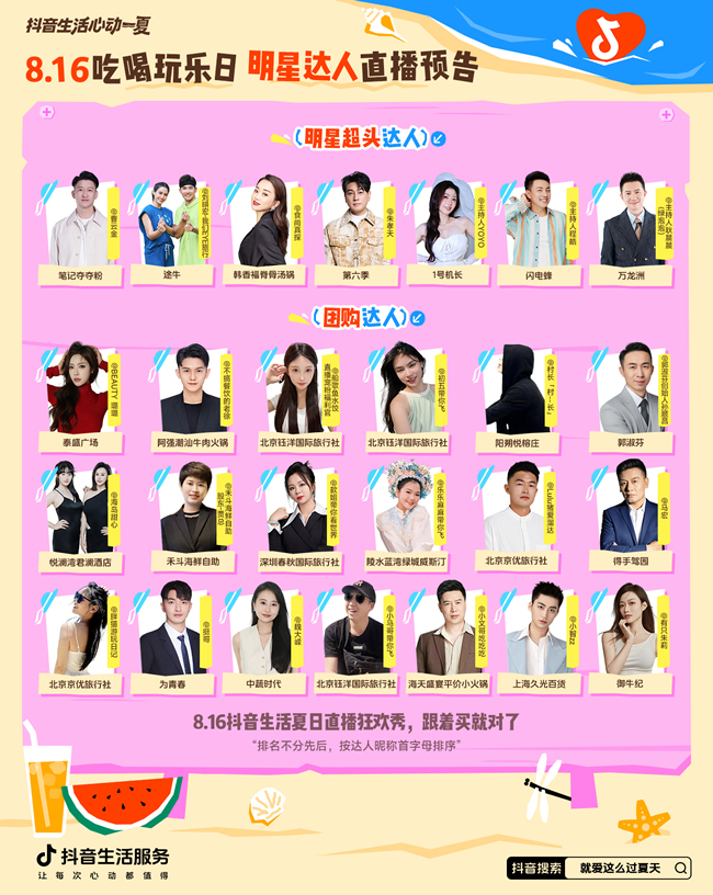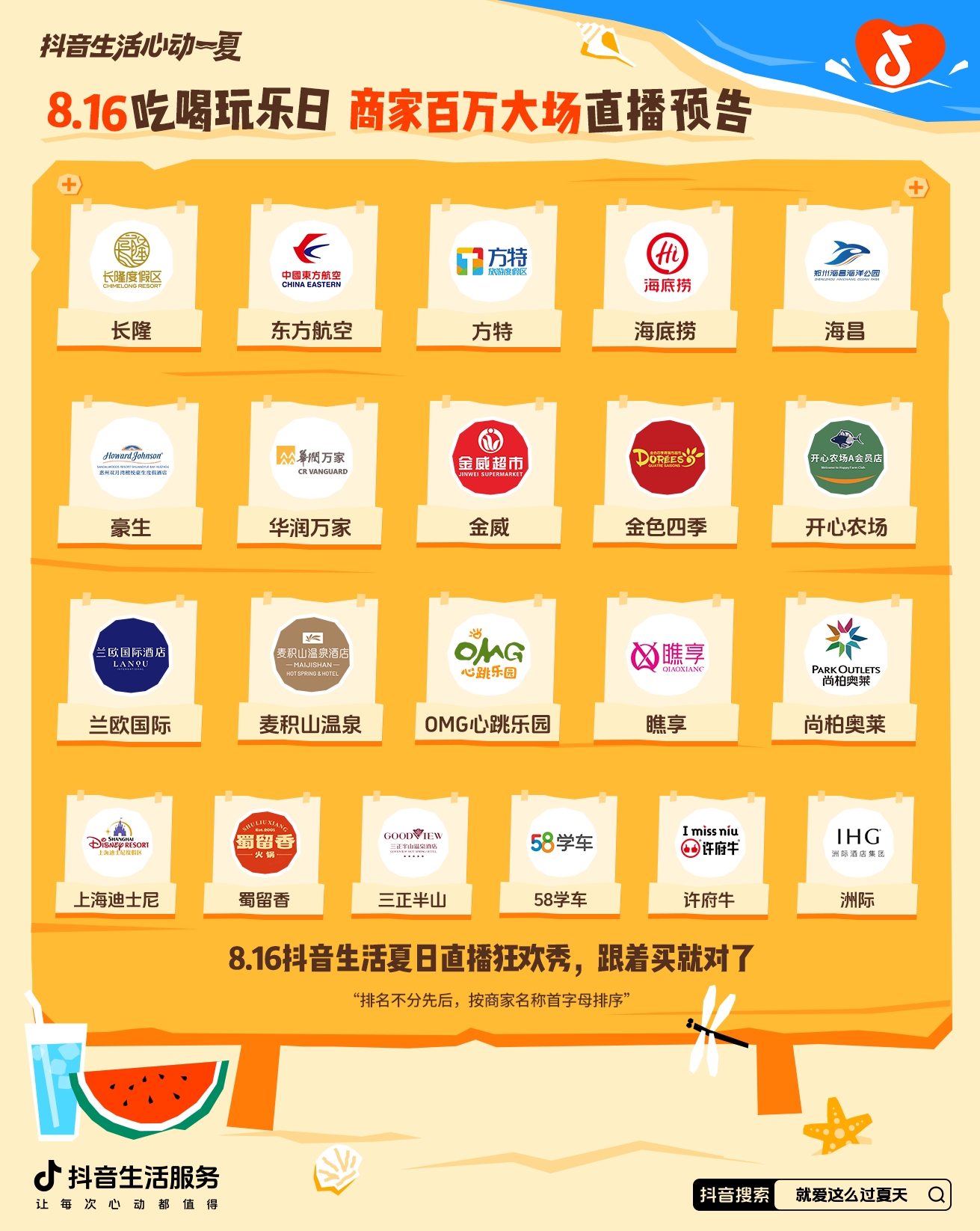 這場(chǎng)夏日狂歡的高潮,將在8月16日火力全開(kāi)!抖音生活服務(wù)直播間將聯(lián)合許府牛、青島極地海洋公園等超多高人氣品牌,開(kāi)啟24小時(shí)專(zhuān)場(chǎng)直播,更有多位明星達人直播間同步開(kāi)播,為大家奉上全天候不間斷的暑期專(zhuān)屬福利!