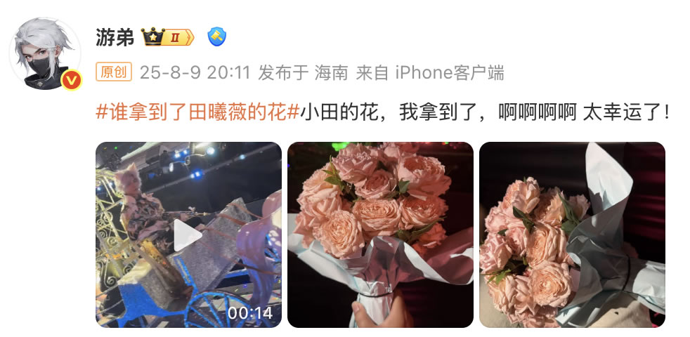 活動(dòng)期間,多元創(chuàng )作者集體發(fā)力,更是調動(dòng)起平臺內生力量,實(shí)現玩家UGC與口碑的精準裂變。盛典當晚,眾多游戲博主不僅直擊現場(chǎng)、解讀亮點(diǎn),更通過(guò)與明星的“破次元互動(dòng)”引爆話(huà)題。例如博主@游第 獲得田曦薇手捧花,相關(guān)博文迅速登上ACG熱榜,并助推#田曦薇美成這樣#登頂熱搜榜、文娛榜TOP1,實(shí)現跨圈傳播。