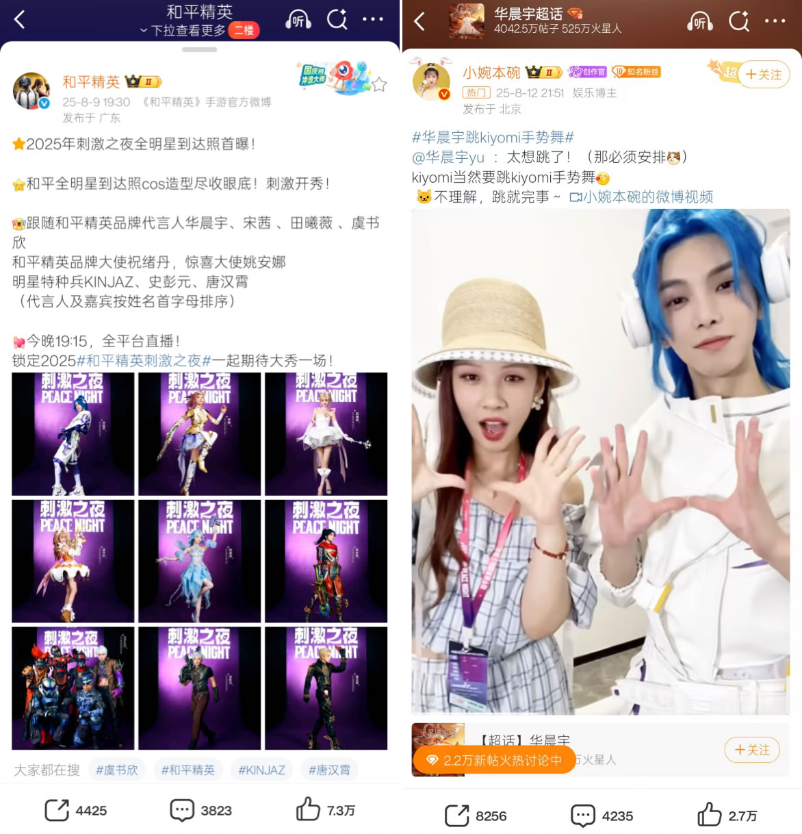 活躍星粉互動(dòng),助推傳播勢能裂變:微博作為文娛熱點(diǎn)主要策源地,此次盛典期間也充分發(fā)揮星粉互動(dòng)勢能,放大品牌代言人影響力;顒(dòng)前期,@華晨宇、@宋茜 等明星在個(gè)人博文頁(yè)面解鎖九大“和平風(fēng)”cos穿搭,炫酷造星在明星個(gè)人演繹下成功打破次元壁,將粉絲期待值拉滿(mǎn)。微博也通過(guò)聚集粉絲間的社交互動(dòng)、二創(chuàng )打call,調動(dòng)起泛文娛受眾的關(guān)注,最終明星博文互動(dòng)量突破700萬(wàn),#田曦薇美成這樣##虞書(shū)欣全開(kāi)麥唱跳#等明星相關(guān)熱搜頻頻登榜,將文娛受眾深度卷入游戲盛事。