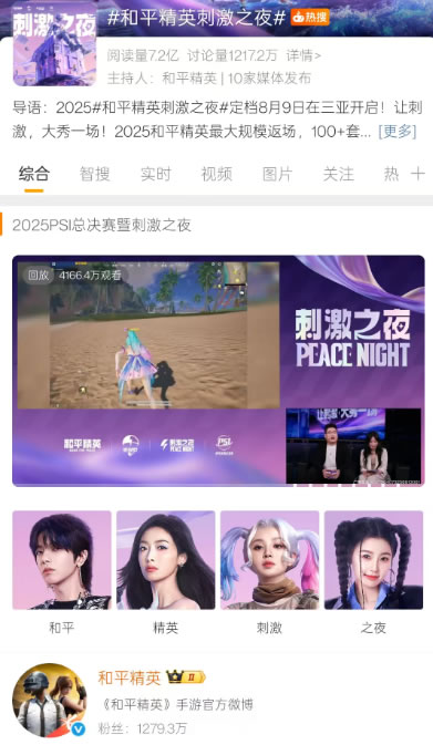 8月9日,海南三亞白鷺體育館成為全國玩家矚目的焦點(diǎn)。2025和平精英PSI總決賽暨空投節刺激之夜年度潮流大秀在此舉辦。四大品牌代言人華晨宇、宋茜、田曦薇、虞書(shū)欣領(lǐng)銜的全明星陣容空降舞臺,與百余名COSER共同演繹九大“和平風(fēng)”潮流趨勢,40米超長(cháng)視效屏與10米巨型空投裝置打造沉浸式體驗,電競與時(shí)尚完美交融。盛典創(chuàng )造的單日219個(gè)微博熱搜、微博直播觀(guān)看量超4100萬(wàn)的亮眼成績(jì),不僅標志著(zhù)活動(dòng)本身的成功,更是展現出第一人稱(chēng)射擊類(lèi)游戲在微博游戲營(yíng)銷(xiāo)助推下的集中爆發(fā)。