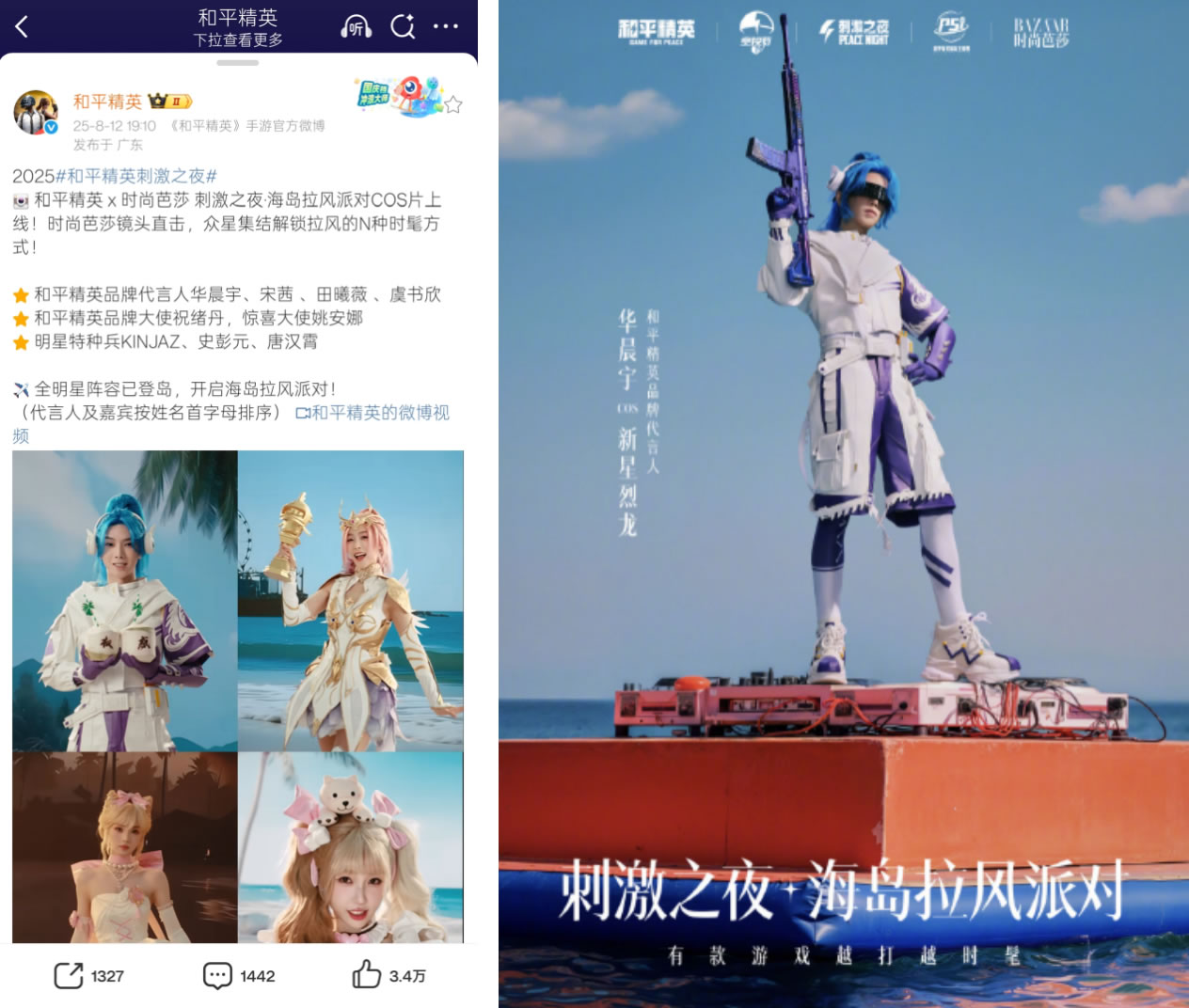 除了上文提及的動(dòng)漫、電競等與游戲緊密關(guān)聯(lián)的泛ACG領(lǐng)域,此次盛典與《時(shí)尚芭莎》的深度合作,通過(guò)明星演繹九大“和平風(fēng)”(戰術(shù)風(fēng)、萌趣風(fēng)、抽象風(fēng)等),在微博掀起時(shí)尚美學(xué)討論,更讓IP觸達時(shí)尚興趣人群的同時(shí),提升活動(dòng)質(zhì)感。同時(shí),借勢線(xiàn)上線(xiàn)下聯(lián)動(dòng),為觀(guān)眾增加文旅層面的圍觀(guān)視角;顒(dòng)落地三亞期間,微博話(huà)題與線(xiàn)下盛況形成共振,#三亞爆改電競之城#等真實(shí)用戶(hù)反饋,驗證了大型游戲品牌活動(dòng)在微博引爆對線(xiàn)下文旅的助推作用。