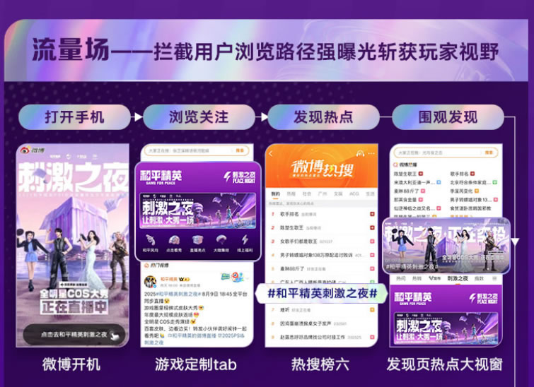 刺激之夜的成功案例,展示了微博為游戲IP提供從核心游戲圈層深耕到動(dòng)漫、電競的關(guān)聯(lián)圈層再到時(shí)尚、文娛等泛興趣領(lǐng)域拓展、從線(xiàn)上熱度引爆到線(xiàn)下文旅聯(lián)動(dòng)的全維度支持能力。從用戶(hù)瀏覽路徑切入,為活動(dòng)吸引曝光、搶占玩家視野,并調動(dòng)大V、原生超粉參與造勢,通過(guò)精準裂變,將活動(dòng)的聲勢最大化。