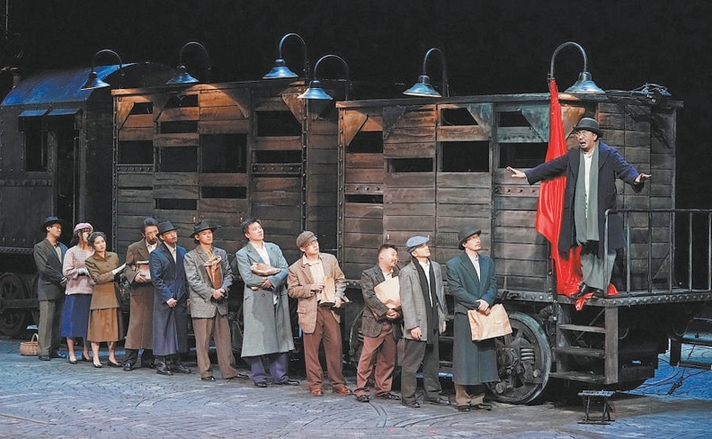 《屠夫》舞臺上,一座巨大的火車(chē)裝置如同時(shí)光機器,連接起人藝三代演員的戲劇情。