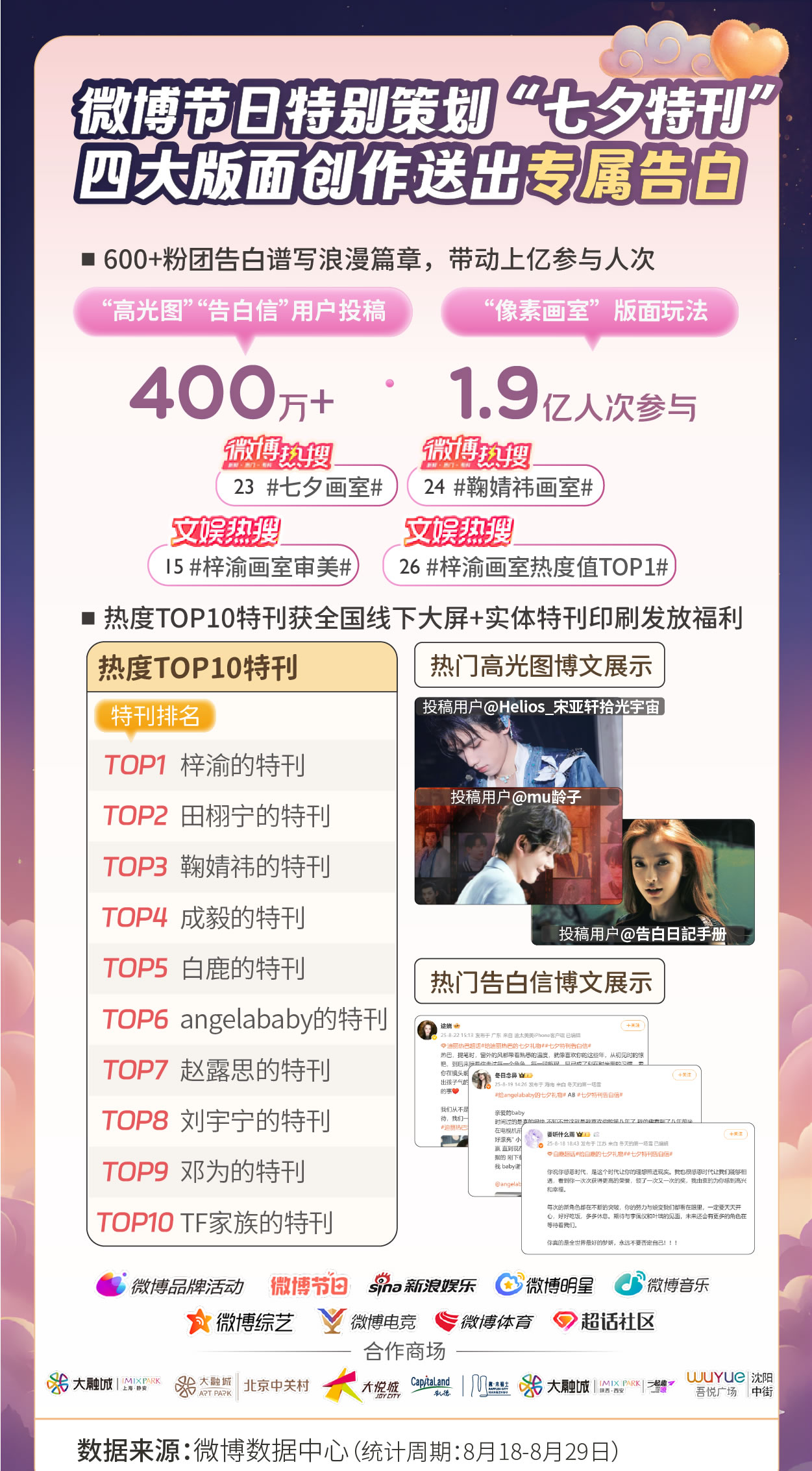 七夕活動(dòng)期間,微博推出的創(chuàng )新玩法實(shí)現線(xiàn)上線(xiàn)下貫穿聯(lián)動(dòng)。報告顯示,600余粉團告白內容通過(guò)“高光圖”“告白信”“像素畫(huà)室”等形式呈現,累計帶動(dòng)上億人次參與。熱度TOP10特刊榜單中,@梓渝、@田栩寧、@鞠婧祎 的特刊分列前三,#鞠婧祎畫(huà)室#、#梓渝畫(huà)室審美#等話(huà)題借勢登榜熱搜。TOP10特刊將同時(shí)斬獲全國六大商圈大屏與實(shí)體特刊印刷發(fā)放福利,為數字化的愛(ài)意賦予可觸摸的溫度。