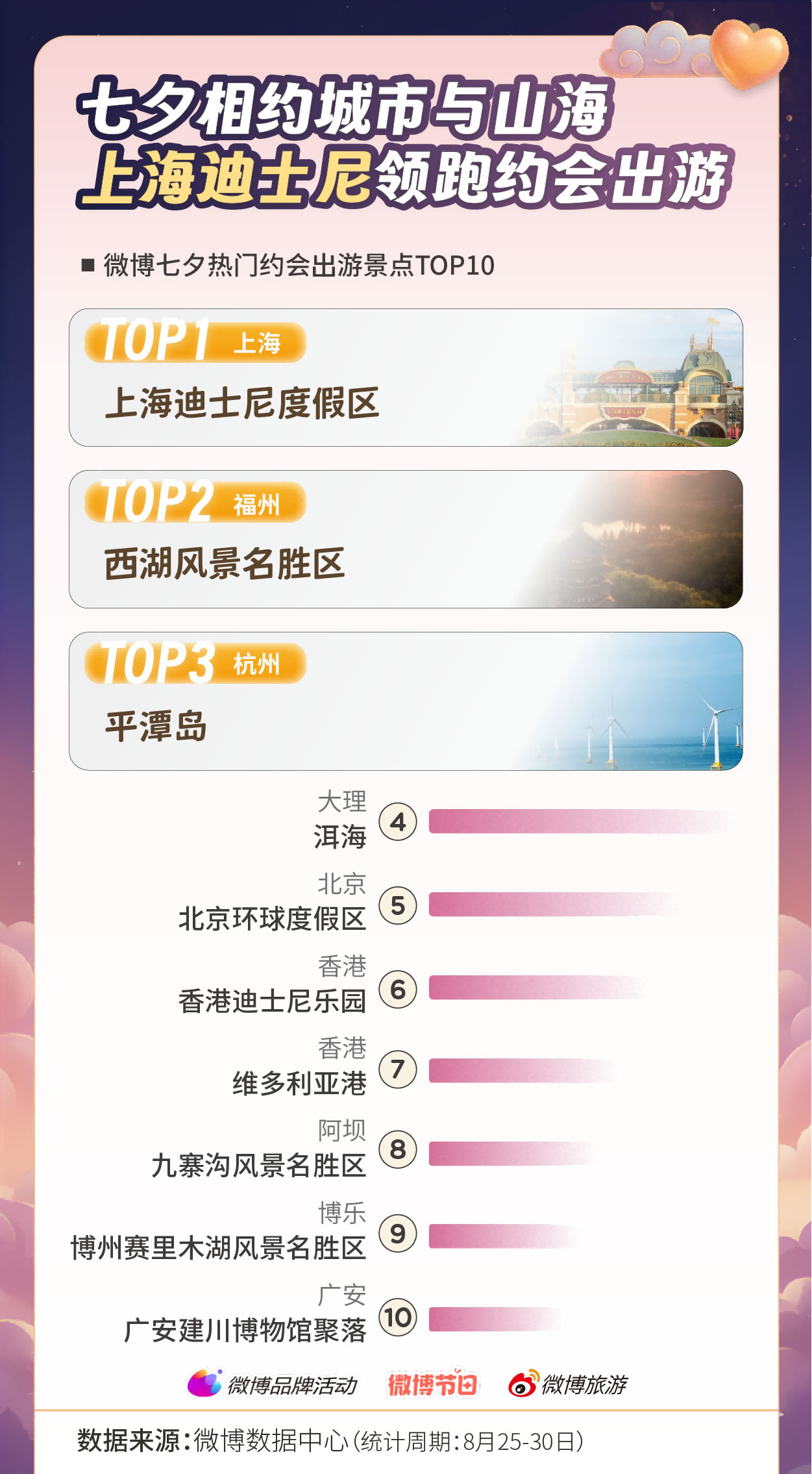 當七夕遇上旅行,伴侶們都要去哪里游玩?報告顯示,微博七夕熱門(mén)約會(huì )出游景點(diǎn)TOP10中,城市打卡是優(yōu)先項目,上海迪士尼度假區居于榜首。同時(shí),年輕人也想奔赴山海,杭州西湖和福州平潭島分列二、三位。此外,大理洱海、北京環(huán)球度假區、香港迪士尼樂(lè )園、香港維多利亞港、阿壩九寨溝等橫跨南北的景點(diǎn)悉數上榜,勾勒出從都市繁華到自然風(fēng)光的多元約會(huì )版圖。從主題樂(lè )園到名山大川,這屆年輕人用腳步丈量愛(ài)情,七夕浪漫也不限于燭光晚餐。