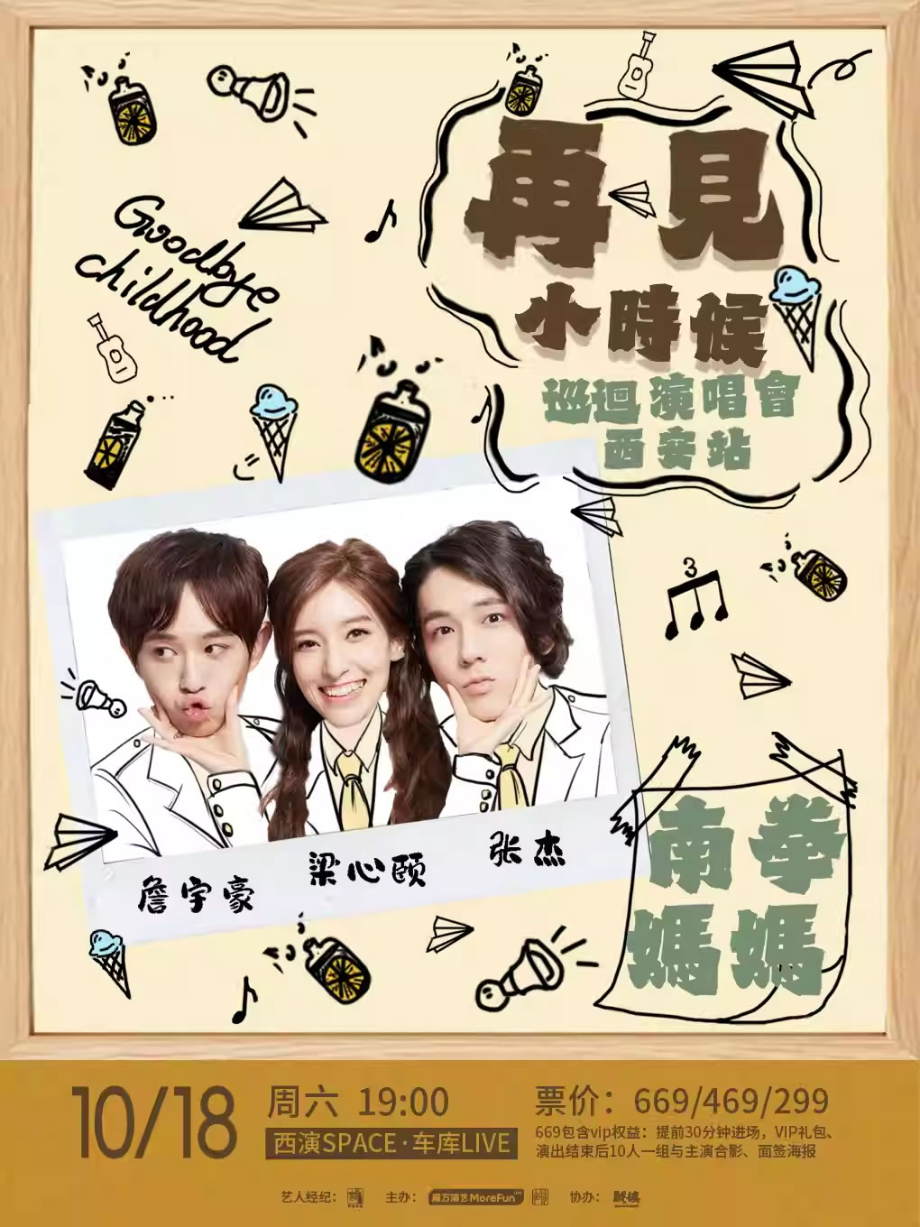 2025年,繼去年「我回來(lái)了」巡演后,南拳媽媽第二代黃金陣容——詹宇豪(鋼琴王子)、Lara梁心頤(甜嗓主唱)、AJ張杰(創(chuàng )作才子)再度合體二巡「再見(jiàn)小時(shí)候」!以音樂(lè )為筆,變身為“青春紀念冊主編”,用音樂(lè )策劃一場(chǎng)專(zhuān)屬你的“青春紀念冊”!