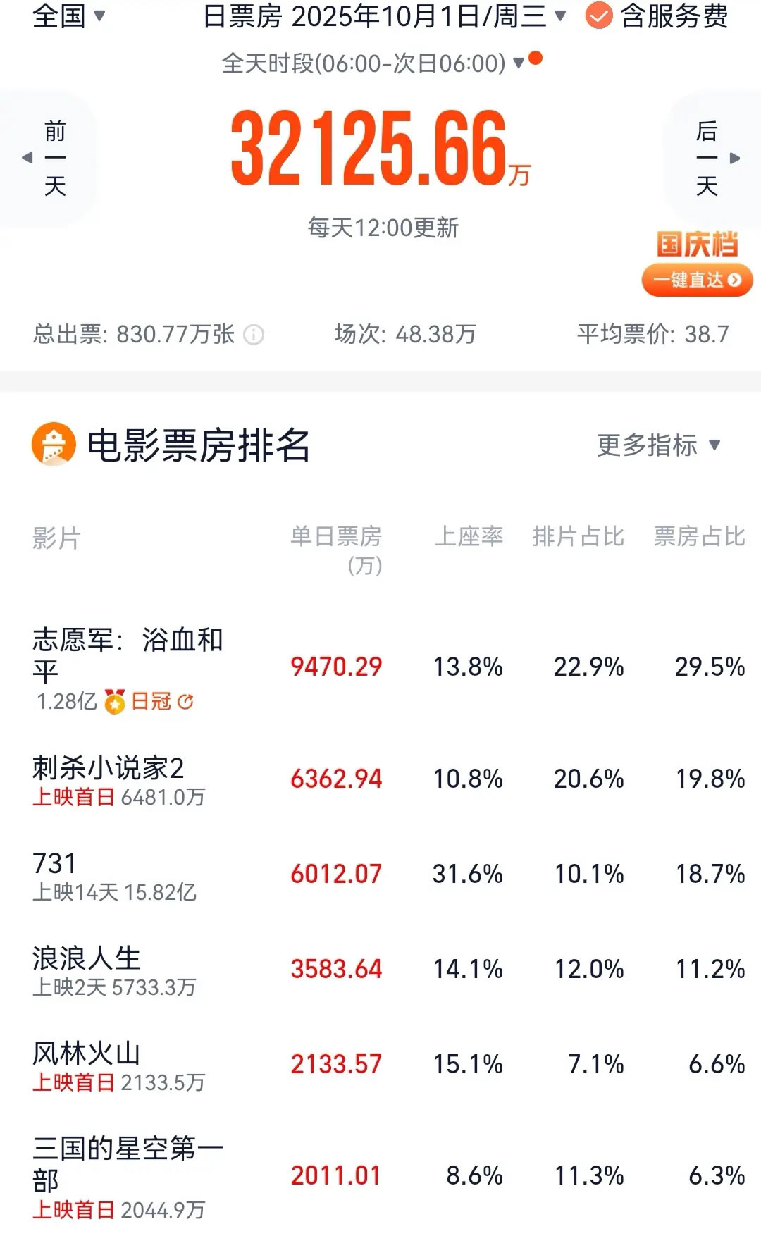 10月1日,《731》以10.1%的排片拿到6000多萬(wàn)元的票房,僅次于《志愿軍:浴血和平》和《刺殺小說(shuō)家2》,排在日票房榜第三,上座率31.6%,是《志愿軍:浴血和平》的兩倍多,是《刺殺小說(shuō)家2》的近三倍,遙遙領(lǐng)先。