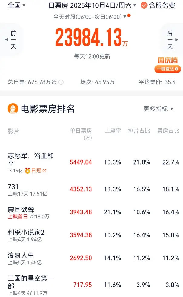 陳凱歌導演的《志愿軍:浴血和平》穩居日榜第一,上映第五天單日票房5449萬(wàn)元,累計票房3.19億元,預計最終票房可能到7億元。
