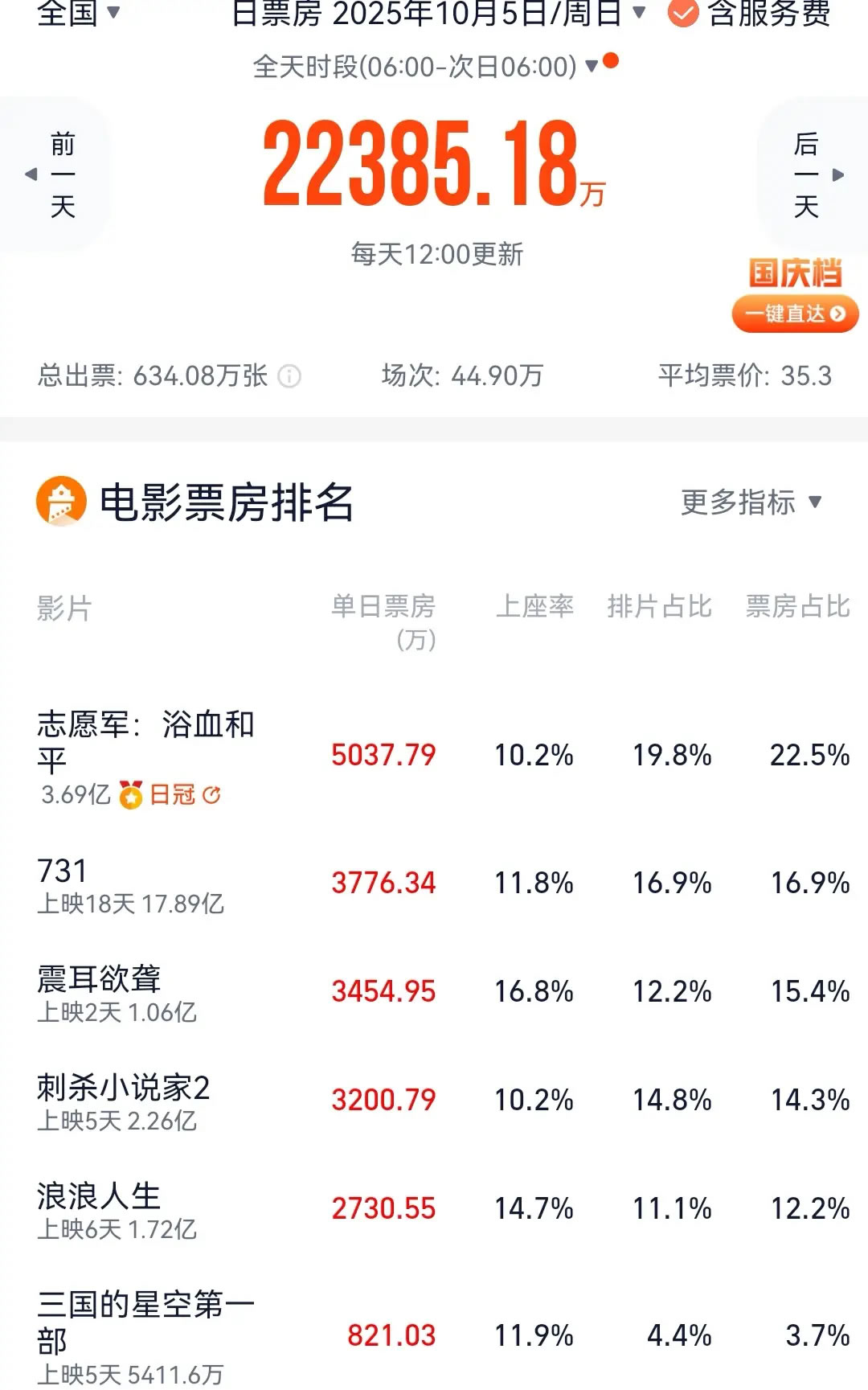 《志愿軍:浴血和平》和《731》穩定在日票房榜前兩名。