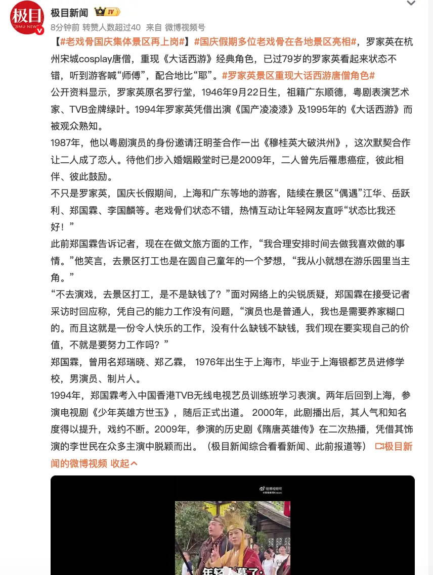 不只是羅家英,國慶長(cháng)假期間,上海和廣東等地的游客,陸續在景區“偶遇”江華、岳躍利、鄭國霖、李國麟等。老戲骨們狀態(tài)不錯,熱情互動(dòng)讓年輕網(wǎng)友直呼“狀態(tài)比我還好!”